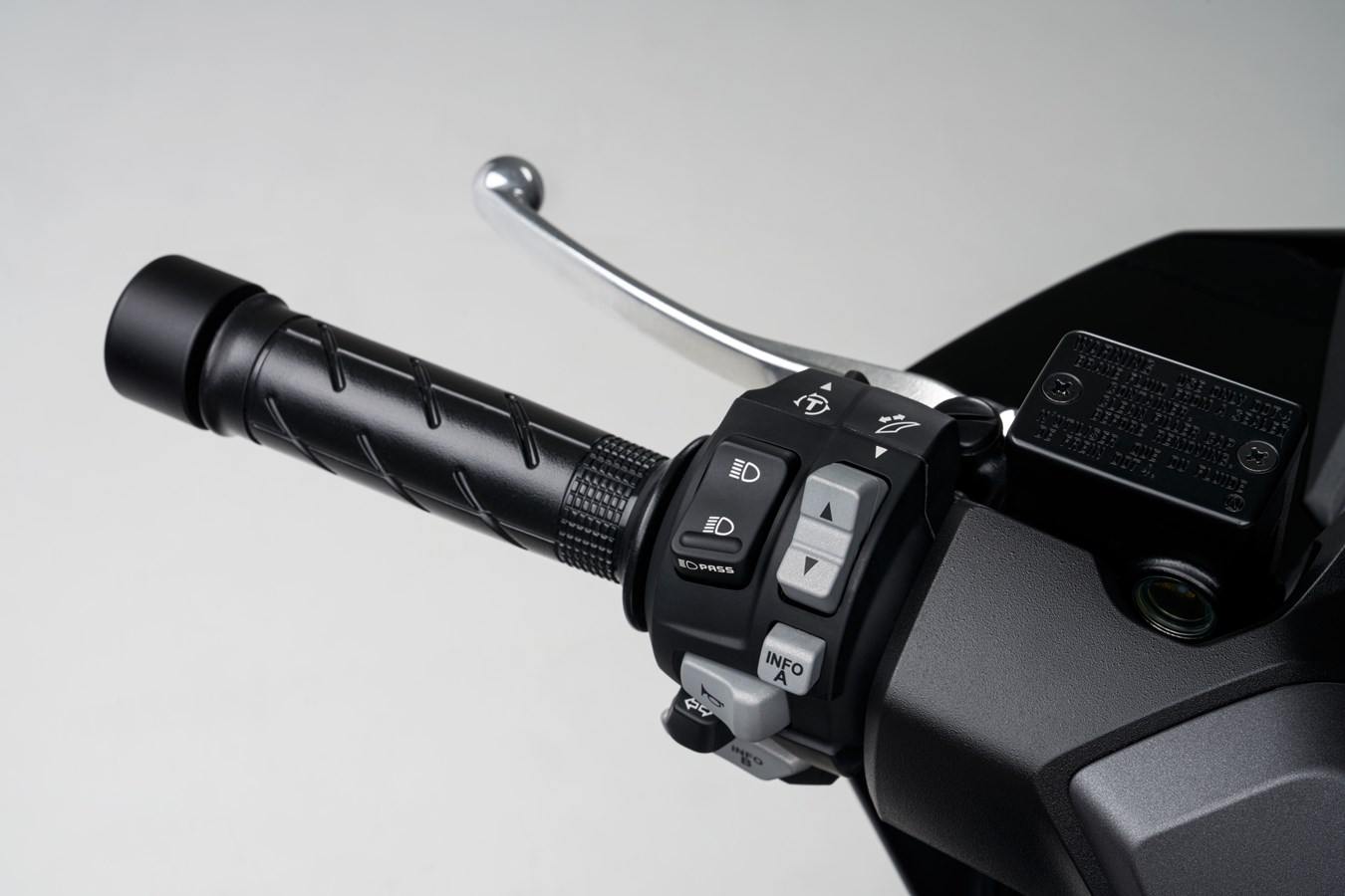 The Forza 125’s lines flow back from the electric screen – controlled by a switch on the left handlebar. Which for the 2021 update gets a revised shape and an extra 40mm travel to adjust through 180mm.