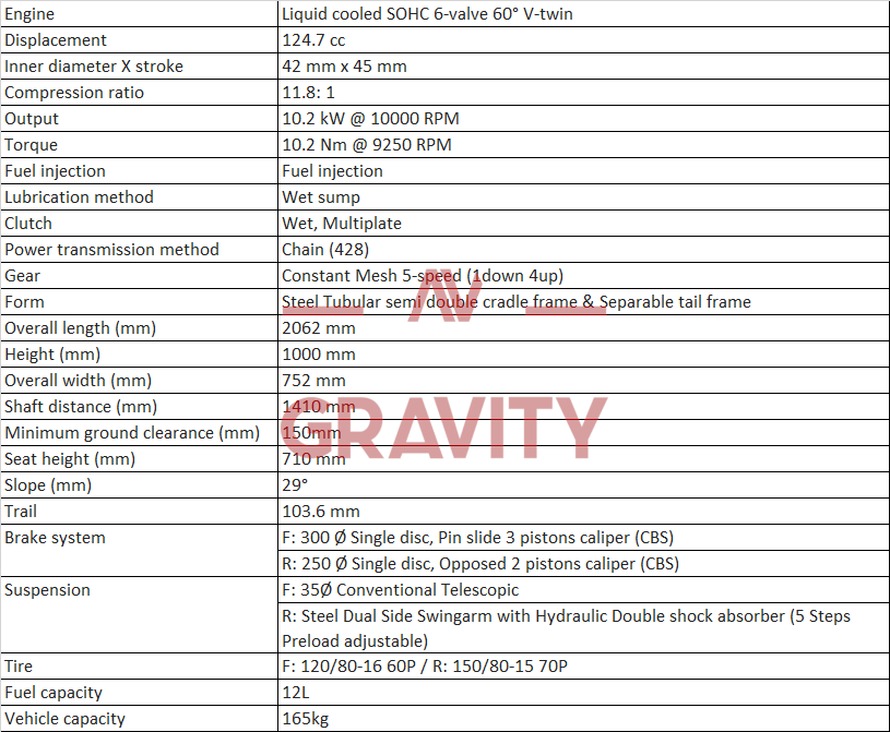 Supported by five-speed gear transmission the motor comes with a 124.7 cc, 60° V-twin engine, liquid-cooled SOHC 6-valve 60° V-twin capable of calibrating 10.2kW (13.6hp) at 10000rpm and 10.2Nm at 9250rpm.