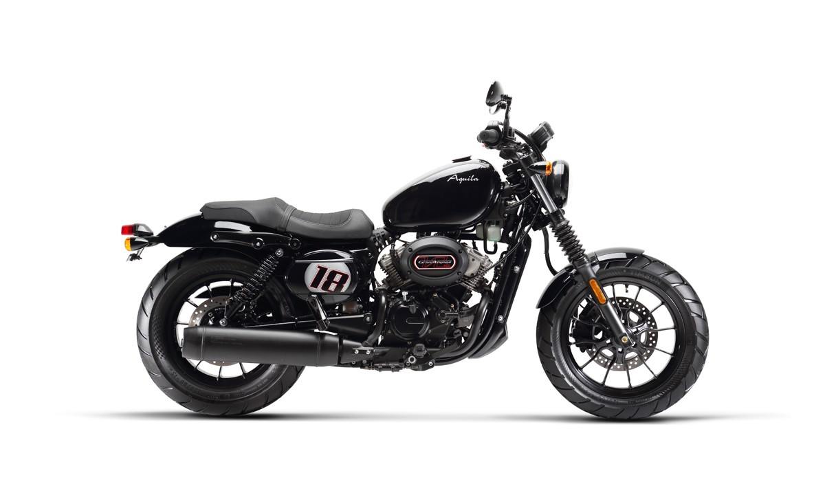 The bobber style Aquila GV 125S comes with 165 kgs and gets 12 l fuel tank. On the front, the brakes are 300 Ø Single disc, pin slide three pistons calliper (CBS) while at the opposite end. They are 250 Ø Single disc, opposed two pistons calliper (CBS).