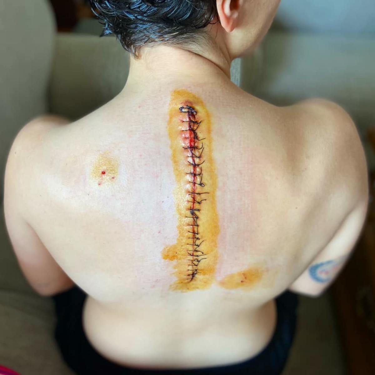 While Ana is recovering, she doesn’t stop to show us how she is recovering by showing her stitches.