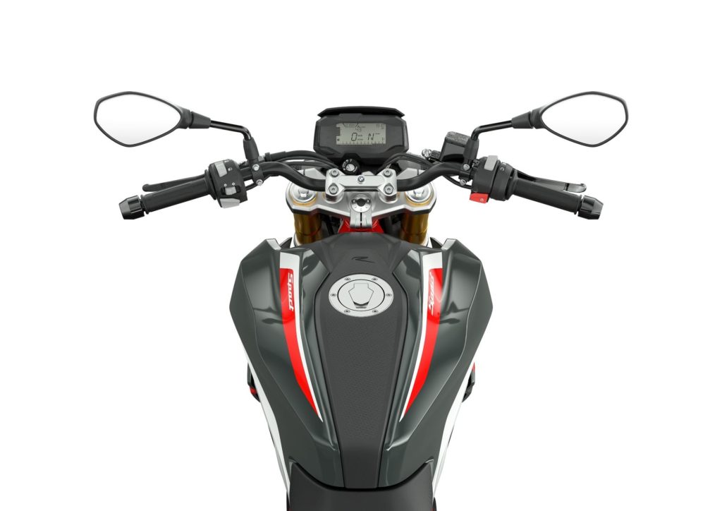 • Engine housing covers for the alternator, clutch and coolant pump, as well as footrest plate and rear grab handle, painted in Titanium Grey Metallic.