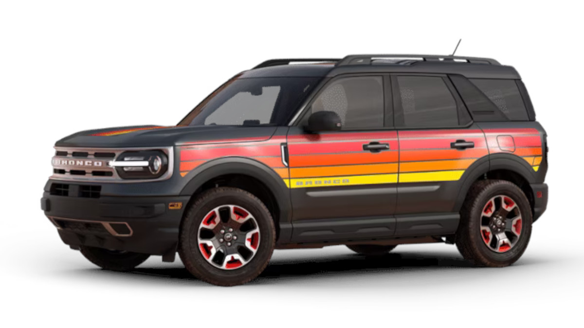 The Free Wheeling Bronco Sport features a special sunset-inspired red, orange, and yellow livery, reminiscent of the ’70s era design. The exterior also includes black steel wheels with red accents and blacked-out finishes on the bumpers, mirrors, and grilles.