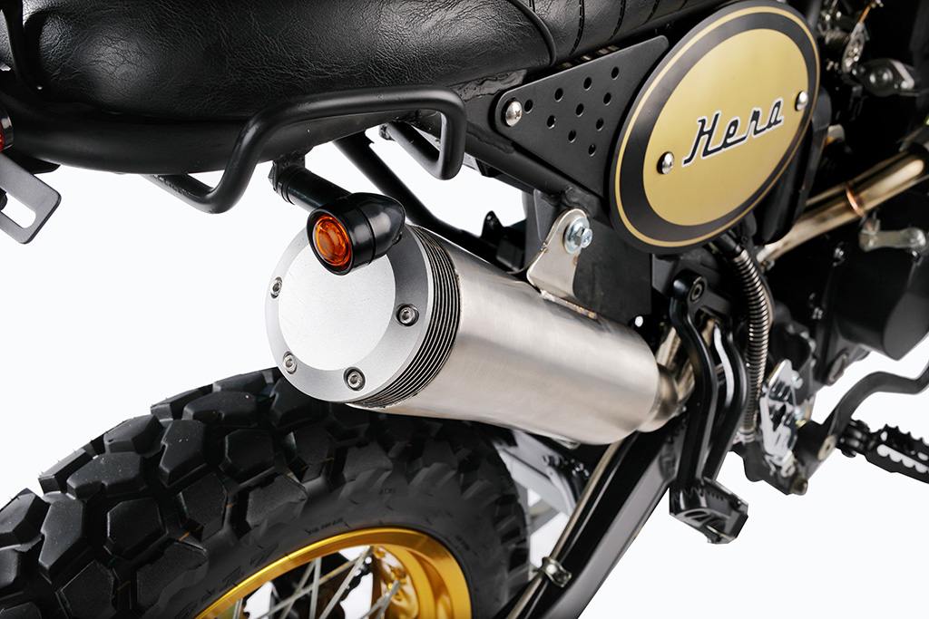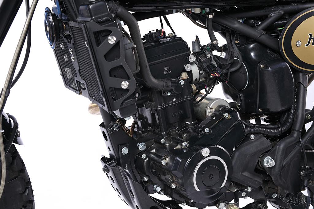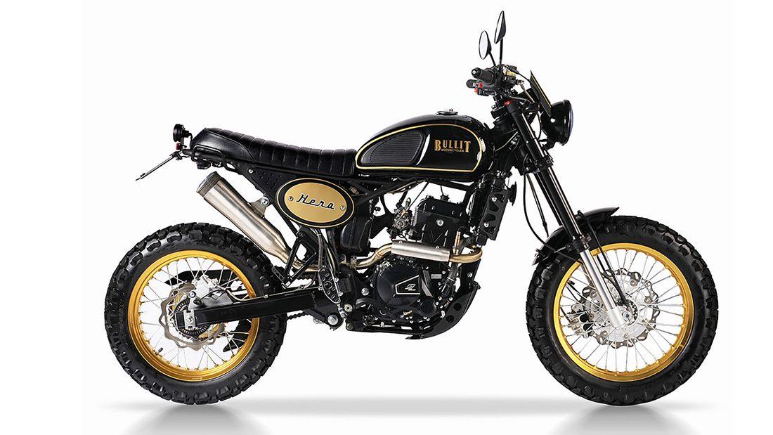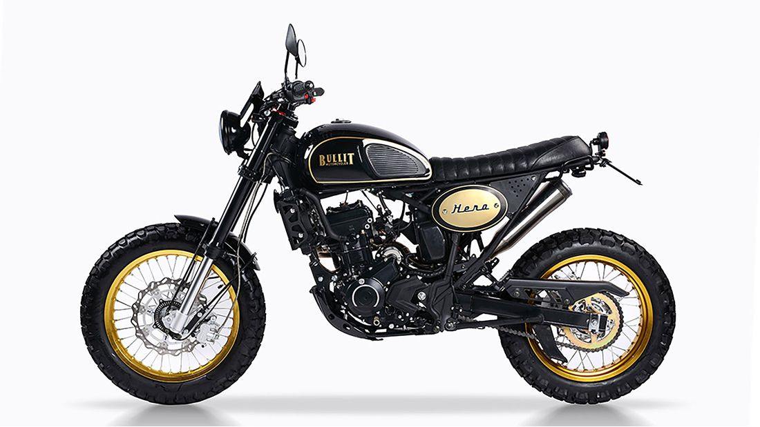 Now Bullit has built a Hero 250cc Scrambler, and it comes with 250cc, single-cylinder, air-cooled, twin-cam, 4 valves and 4 stroke motor and it calibrates to 26.5hp.