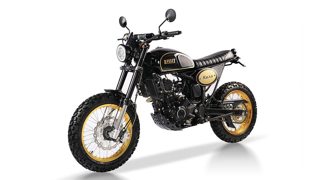 Now Bullit has built a Hero 250cc Scrambler, and it comes with 250cc, single-cylinder, air-cooled, twin-cam, 4 valves and 4 stroke motor and it calibrates to 26.5hp.