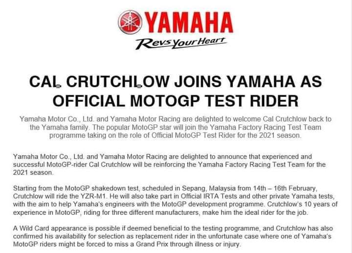 Yamaha Motor Co., Ltd. and Yamaha Motor Racing are delighted to announce experienced. And successful MotoGP-rider Cal Crutchlow will be part of the Yamaha Factory Racing Test Team for the 2021 season.