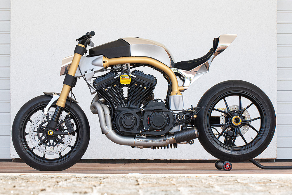 At the same time, the chassis takes inspiration from Voxan. On the other hand, the V-Twin gets support from a custom SC-Project two-into-one carbon fibre muffler with a pair of 39mm carbs from Keihin FCR and high flow filters.