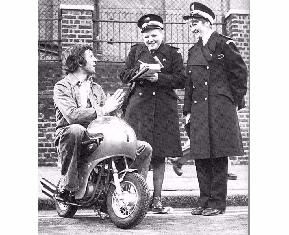 The photograph that most inspired people in general at the time, depicted in a highly contrasting Phil Read sitting on the small bike that asked two stopping orderlies (in England) to influence it to leave without a fine.