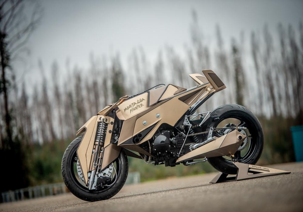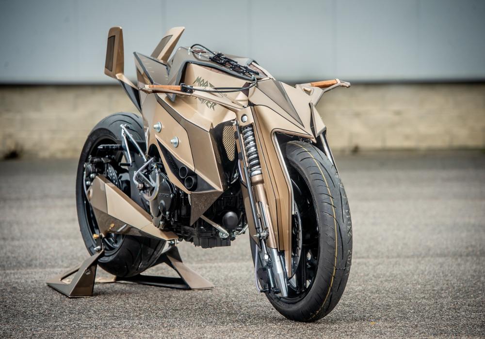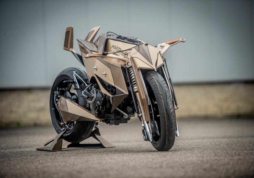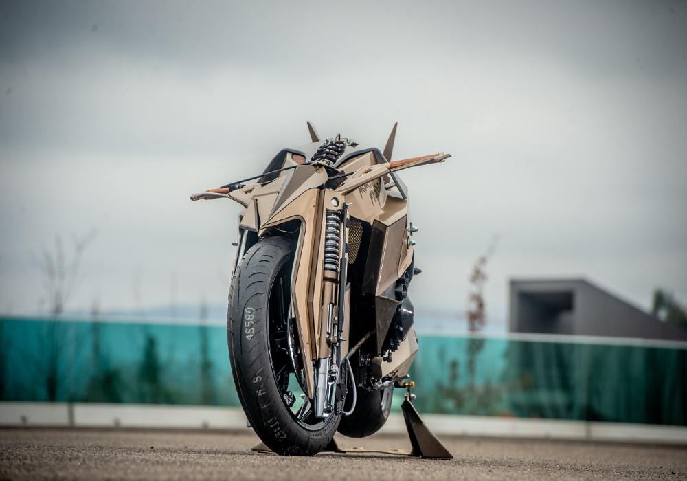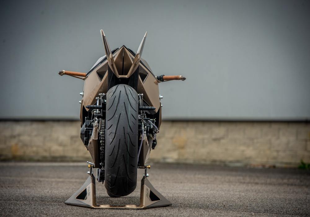 The net membrane near to forks on both sides looks cool. The grip seems wooden. The rear comes inspired by the fighter plane’s tail and does give good support to the rider.