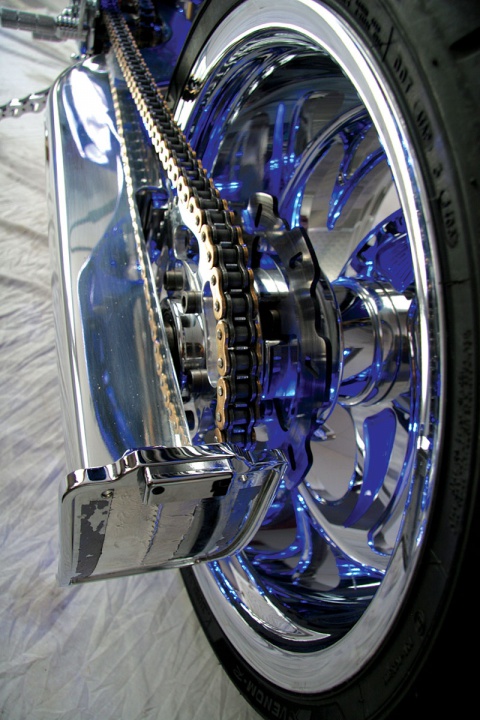 The gigantic back wheel has likewise been machined from a square of billet combination and afterward cleaned to a mirror complete before being chrome plated. The wheel spokes have been inlayed with blue to add a pleasant complexity to the chrome.