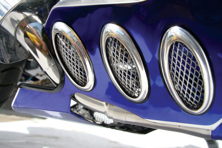 The blue chrome bodywork is something different. Other than the astonishing paint there is such a great amount to take in, for example, the headlights in the fairing, the encompasses have been given the blue chrome treatment. The specially designed air admissions, painted chrome obviously, keep a supply of air streaming to the airbox.