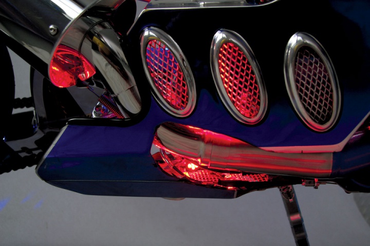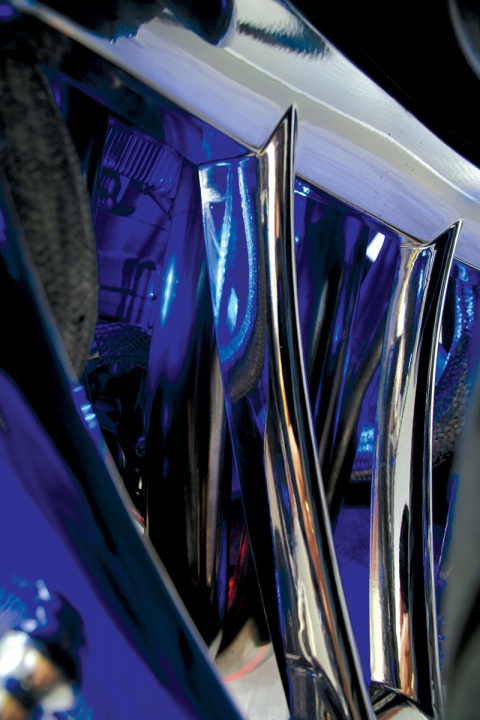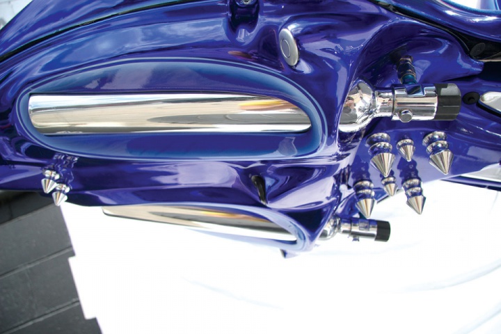 The blue chrome bodywork is something different. Other than the astonishing paint there is such a great amount to take in, for example, the headlights in the fairing, the encompasses have been given the blue chrome treatment. The specially designed air admissions, painted chrome obviously, keep a supply of air streaming to the airbox.