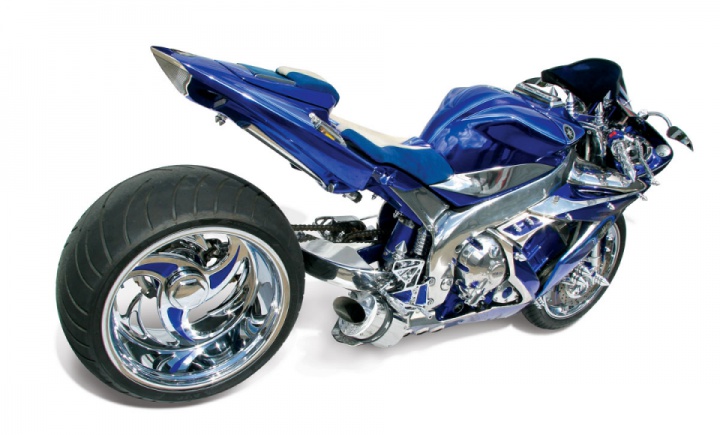 The gigantic back wheel has likewise been machined from a square of billet combination and afterward cleaned to a mirror complete before being chrome plated. The wheel spokes have been inlayed with blue to add a pleasant complexity to the chrome.