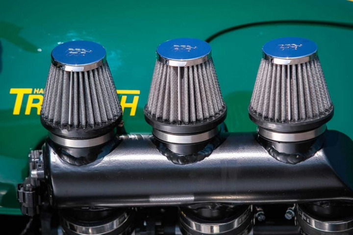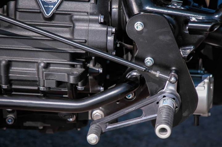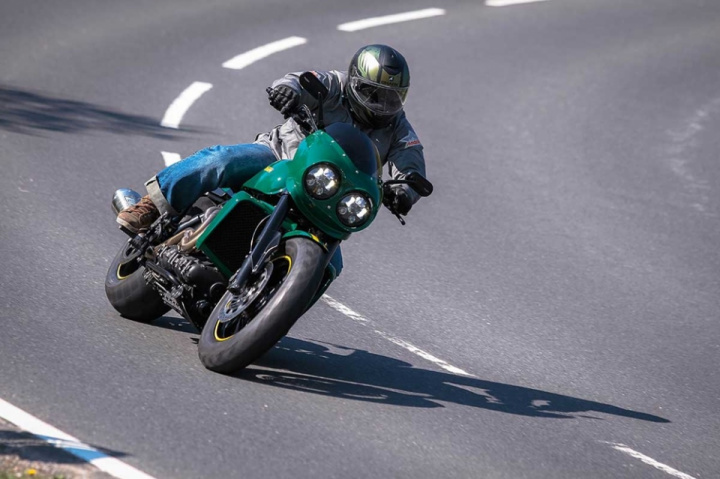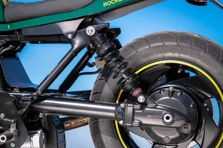The custom gets custom bodywork (fenders, fairing, tank, and seat), custom footpegs, stock Rocket 3 engine. Wilber shocks for better performance, advanced forks, exhaust system from Zard and K@N Filters.