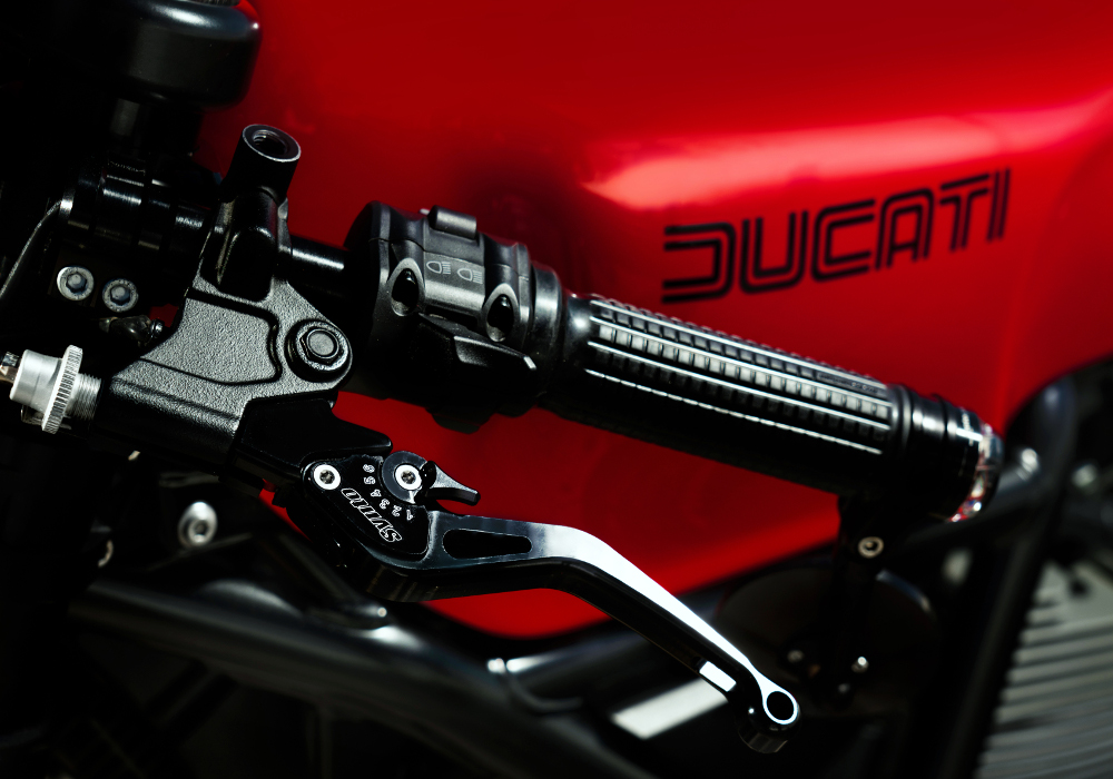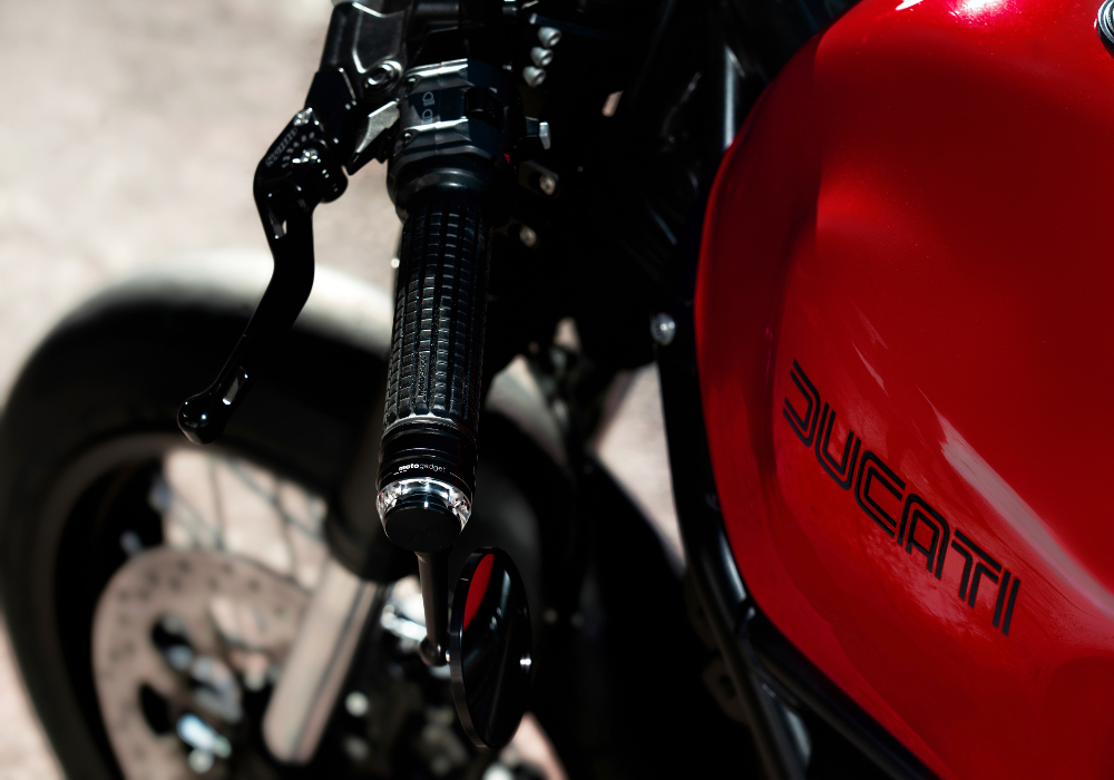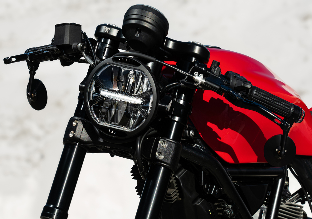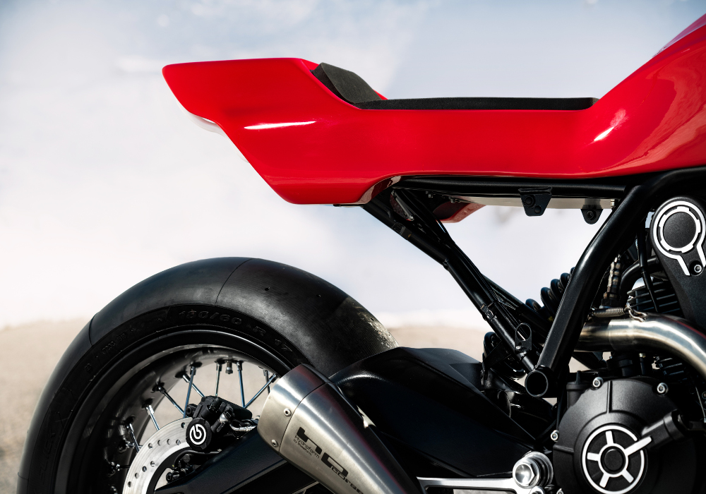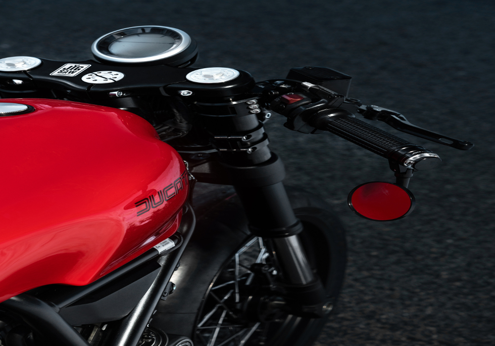 Motogadget provided them the front signals- handle bars, grips and left and right mirrors.The seat in black is made thin to go more with design and shape of the motorcycle.