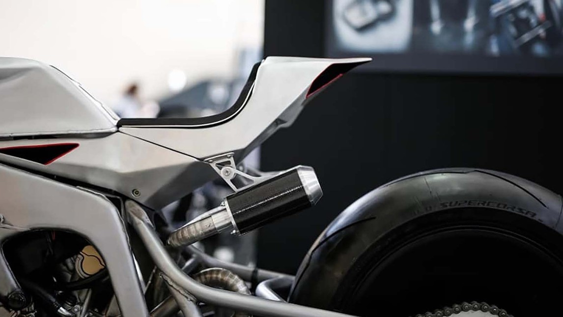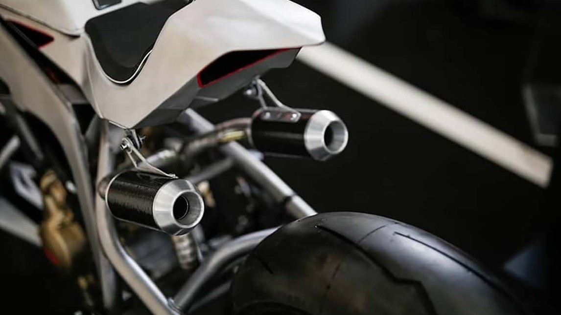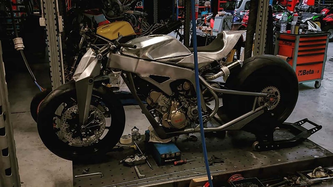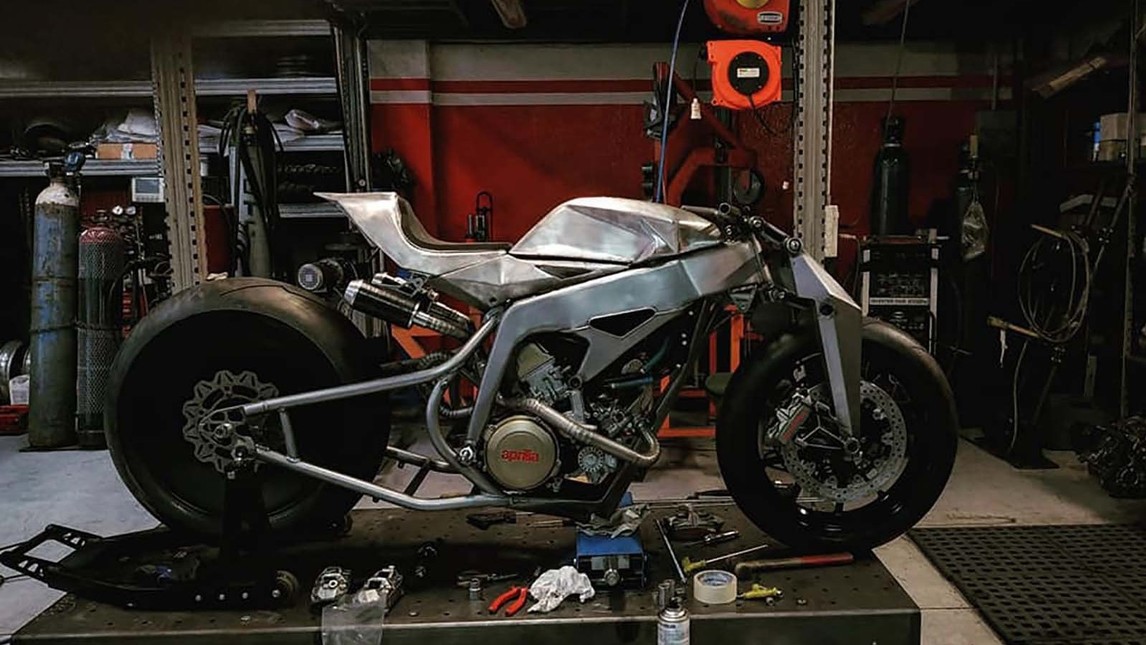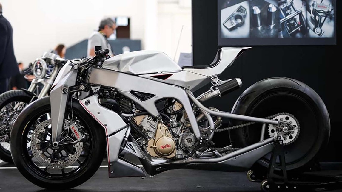 Apart from engine everything was build from zero, front forks,shock absorbers, the design.The motorcycle looks very sharp with one silver paint scheme used . Front brake duties are performed by Brembo’s. Aprilia engine does give surprise as one normally expect it to be custom moto bike but this build defies that saying and looks entirely different.