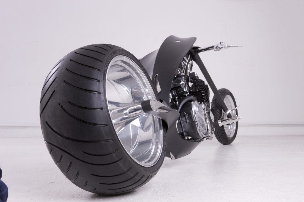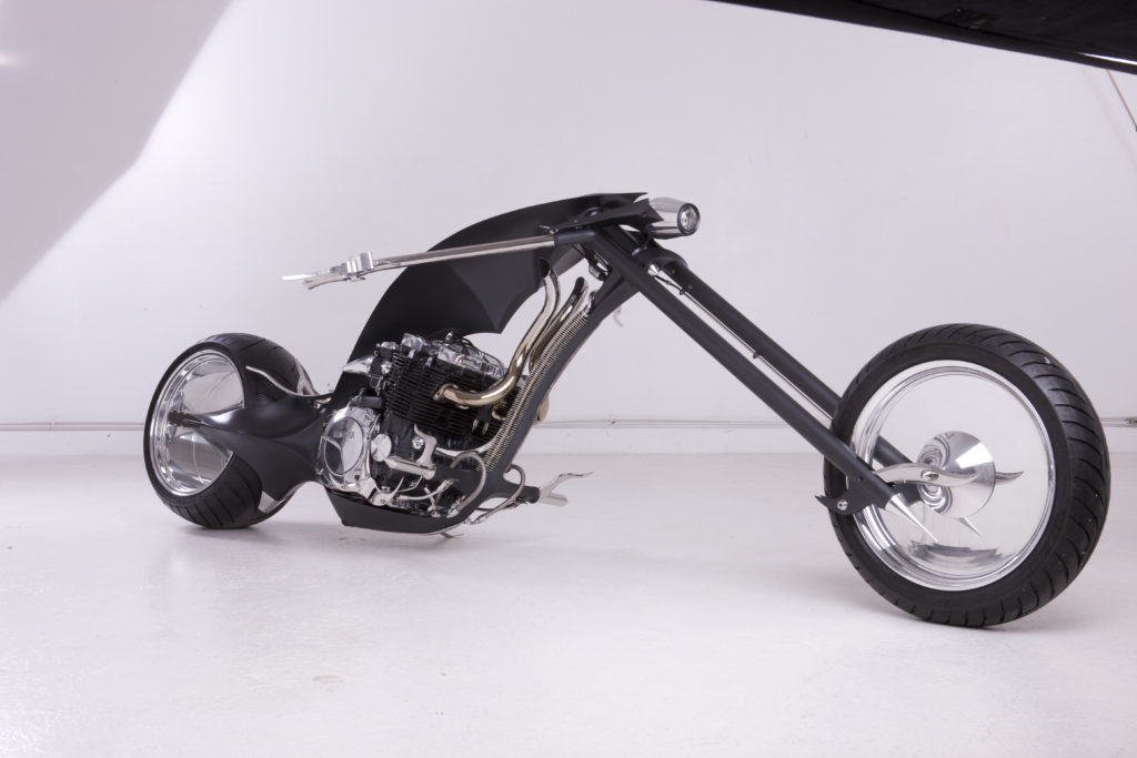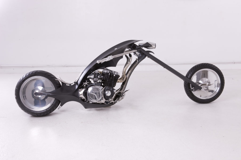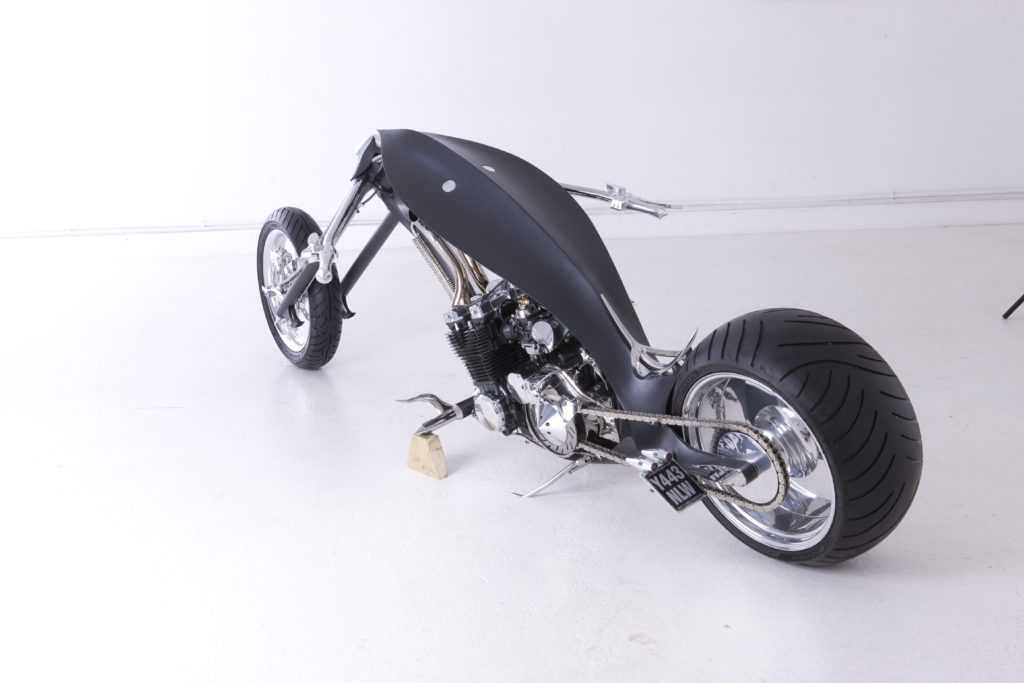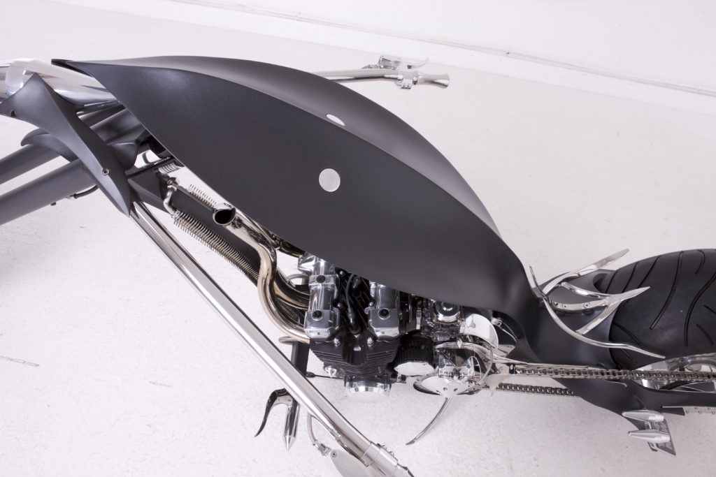 The entire bike is painted in Matte Black paint scheme except for the wheels and long handlebars with sharp edges all over. The exhaust pipes are golden in color and their output is below the fuel tank section that itself shows Paul’s vision to build something different.