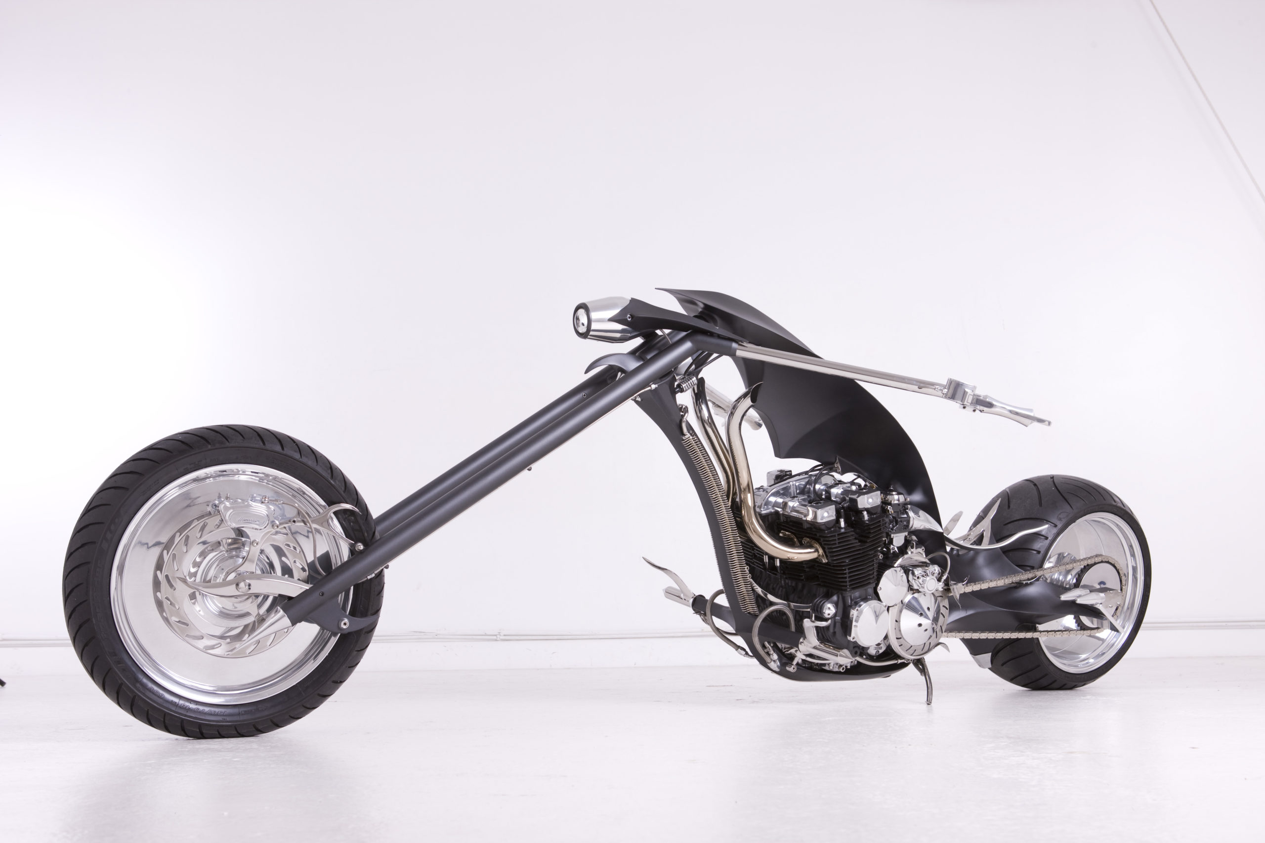 The entire bike is painted in Matte Black paint scheme except for the wheels and long handlebars with sharp edges all over. The exhaust pipes are golden in color and their output is below the fuel tank section that itself shows Paul’s vision to build something different.