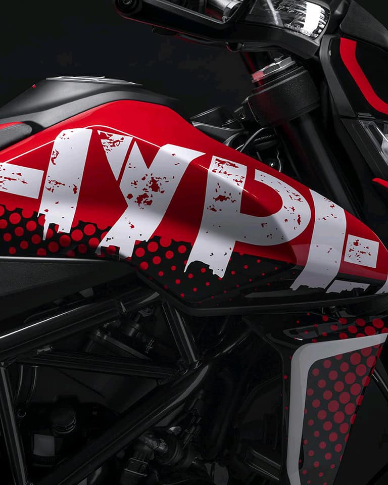 - The RVE version is characterized by special “Graffiti” livery, a striking graphic design inspired by that of the Hypermotard 950 Concept presented in 2019 at the Concorso d’Eleganza Villa d’Este