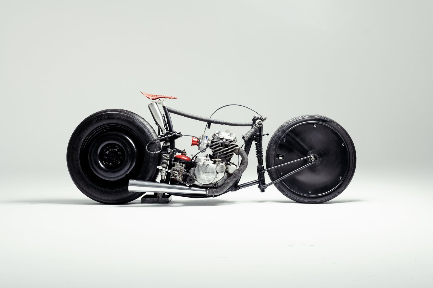 What do you get when you take a Kawasaki KZ250 engine, add a car’s spare wheel and bolt on a bicycle seat? You get one of the most extended and bonkers project bikes you’re ever likely to see.
