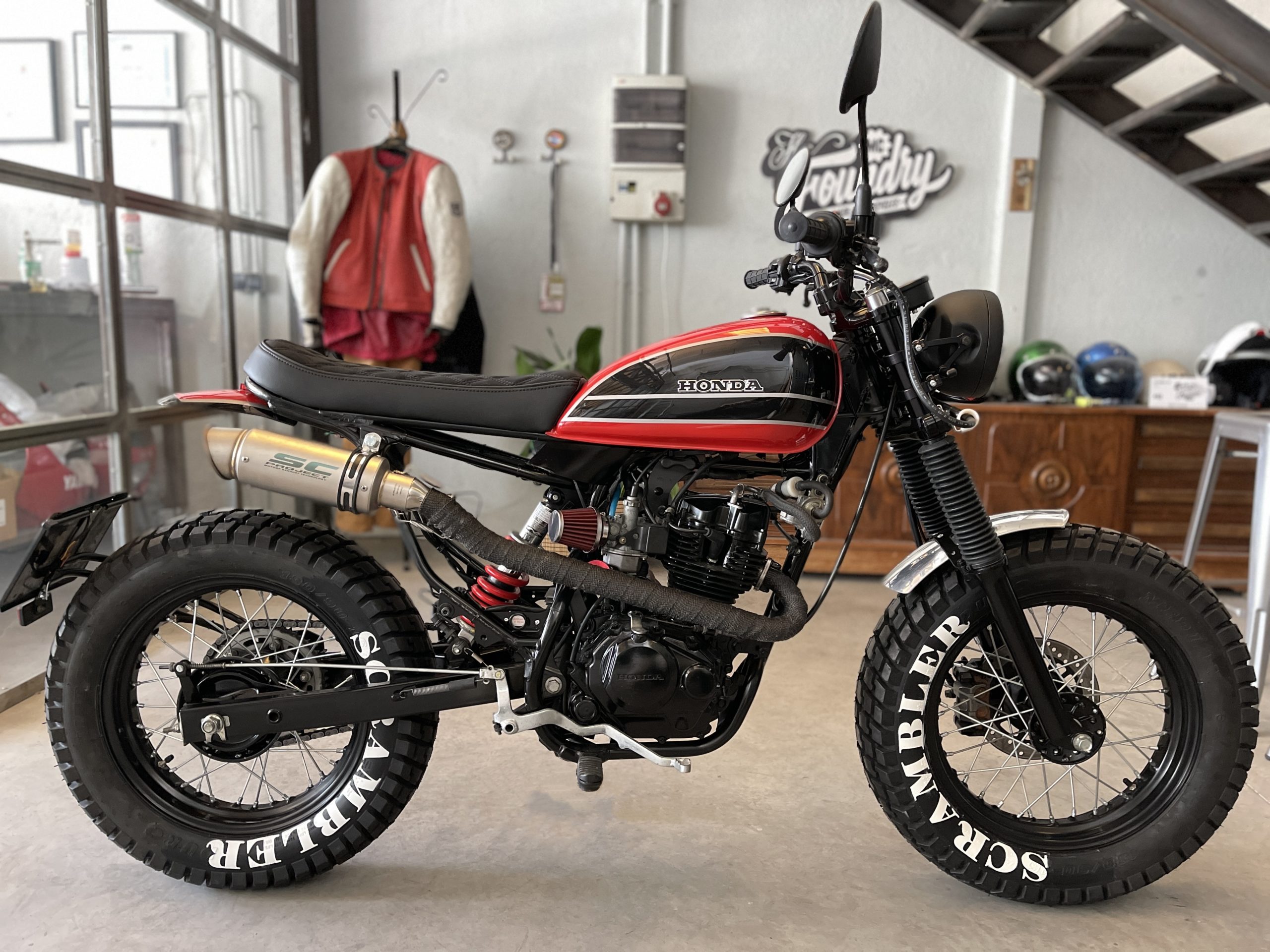 Black paint for the frame and wheels, a gas tank with the same colours as the Azfer’s Bombardero and huge Scrambler letters on the tires complete the replica. Next, enjoy the ride.