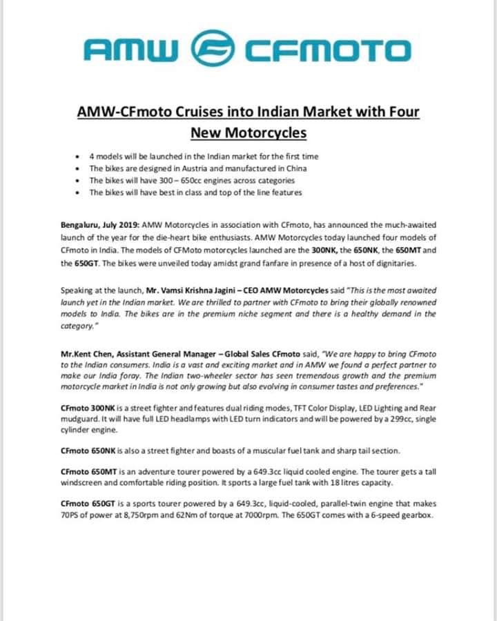 Bangalore based AMW CFMoto unveiled four models in India 300NK, 650NK, 650MT and 650GT. Here is the gallery of all the bikes that are launched and its information.
