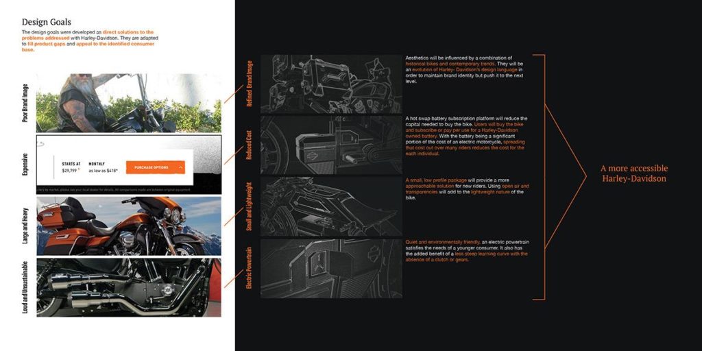 Design goals were developed as a direct solution to the problems addressed with Harley Davidson. They are adapted to fill the product gap and appeal to identify the customer base.