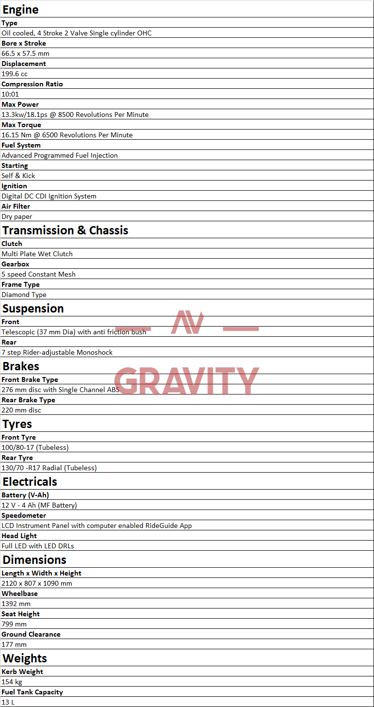 With advanced programmed fuel injection, the oil-cooled, four-stroke two single valve cylinder OHC 199.6 cc engine calibrates to make 13.3kw/18.1ps @ 8500 rpm and 16.15 Nm @ 6500 rpm as torque.