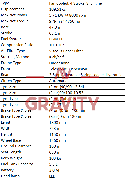 The 109.51 cc, fan Cooled, 4 stroke, SI engine motor makes 5.71 kW (7.6hp) at 8000 rpm and 9 Nm at 4750 rpm torque. With 47.0 mm * 63.1 mm Bore*Stroke further, the Dio also come with silent start responsible for removing the gear meshing noise.