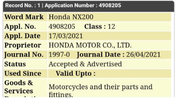 Honda Motorcycles India has applied for the NX200 trademark last month as well as on April 26th.