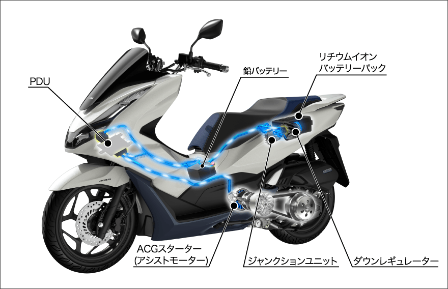 The PCX e: HEV adopts a hybrid system based on the PCX, using a high-power lithium-ion battery as an energy source.