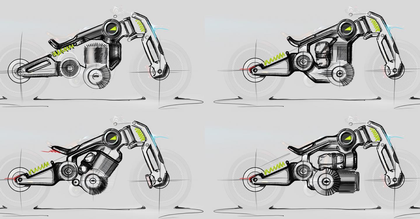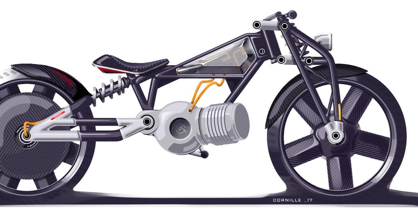 Circa 2017. A clean sketch of an alternate dual battery Y-block study, this time with an in-hub rear motor.