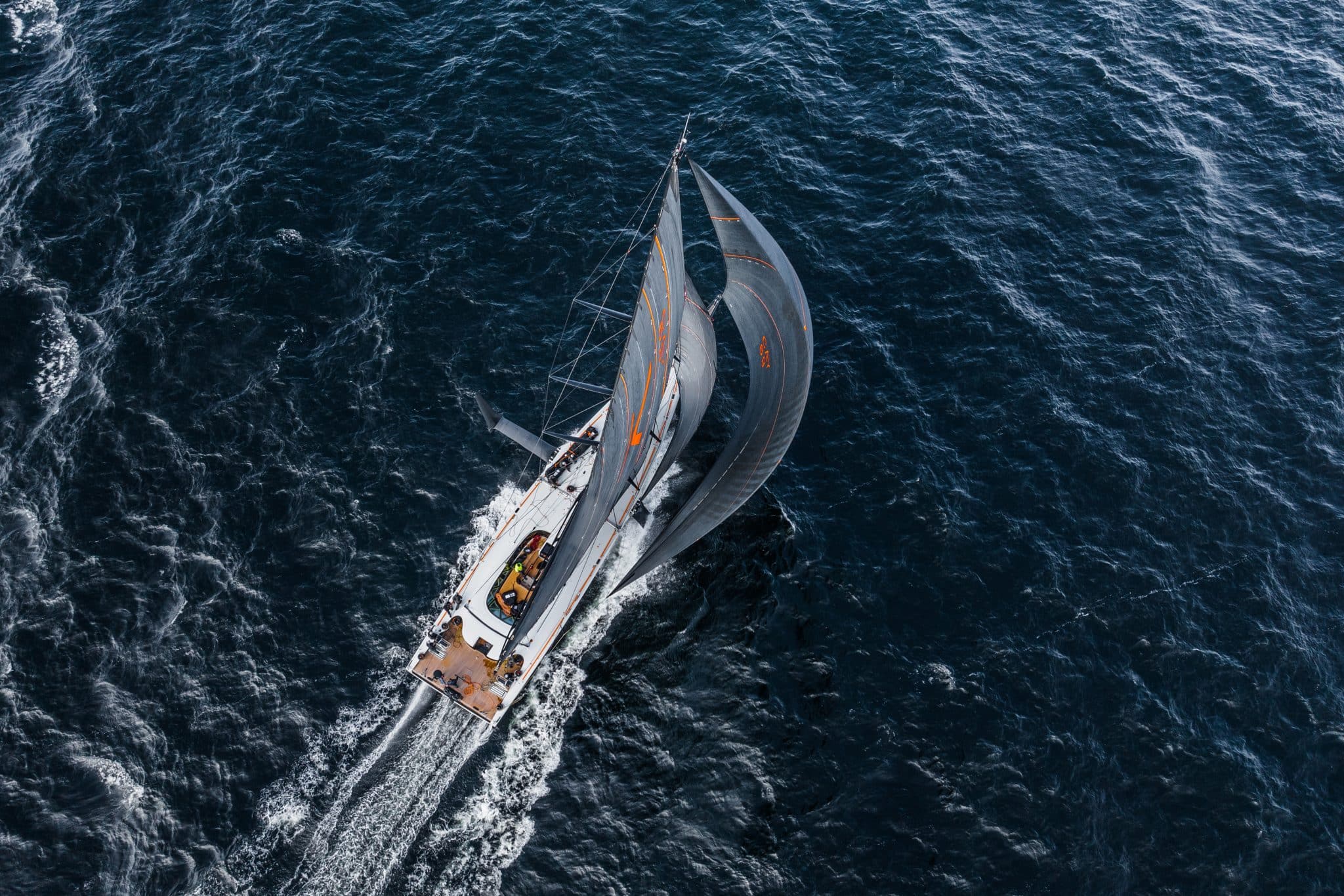 To achieve this weight reduction, materials such as carbon fibre and Nomex were used extensively throughout the yacht’s construction. Raven’s North Sails, for example, are made from North 3Di carbon-fibre, and her rigging uses Harken Air winches for maximum strength and minimum weight.