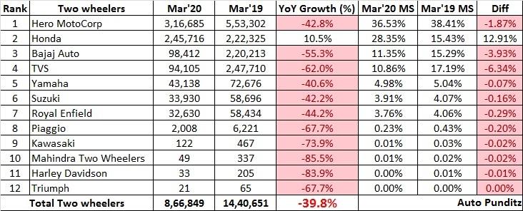 Below snapshot from Autopunditz shows Honda was the only two-wheeler company to show positive YoY growth in March 2020. Rest all the figures are very pessimistic.