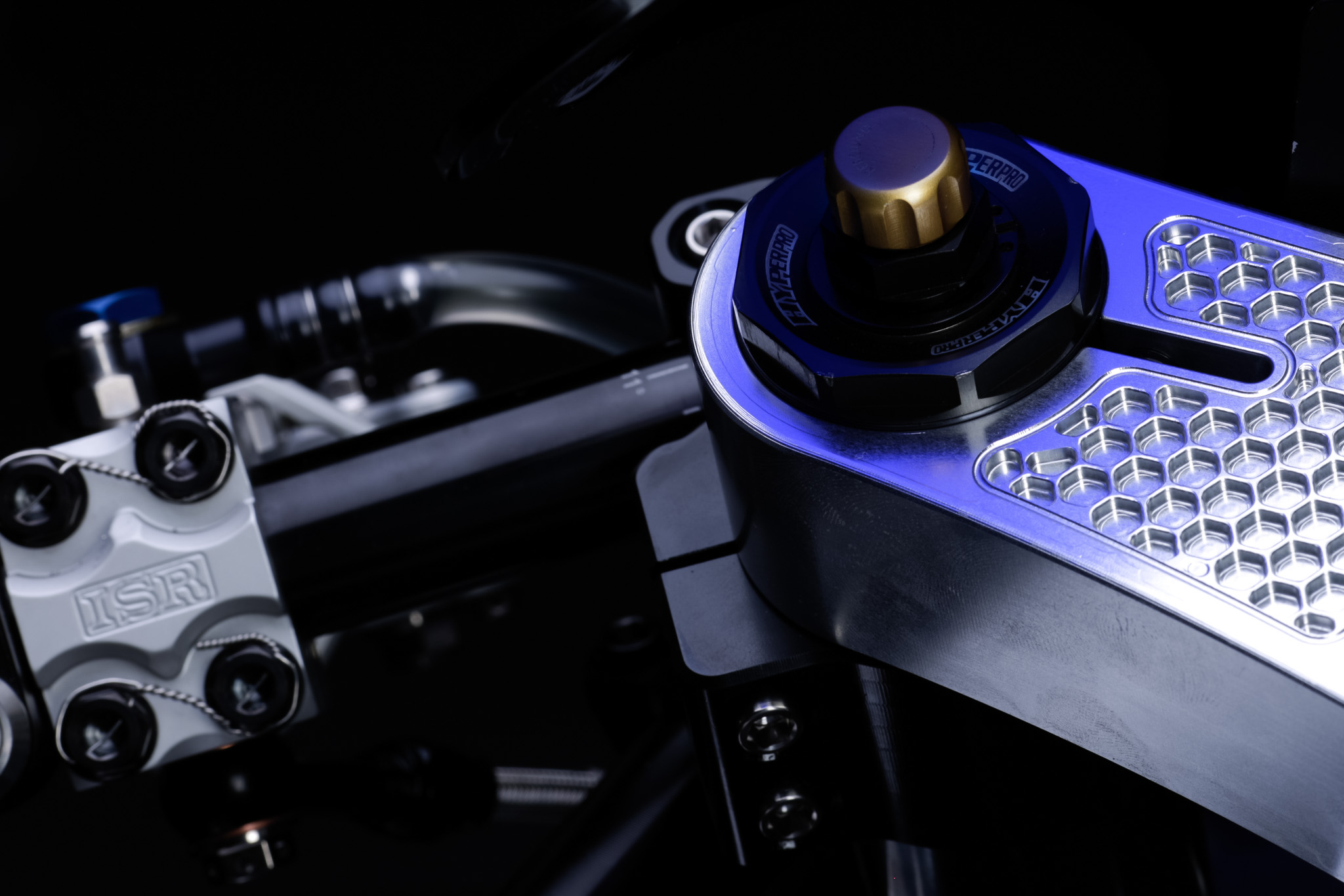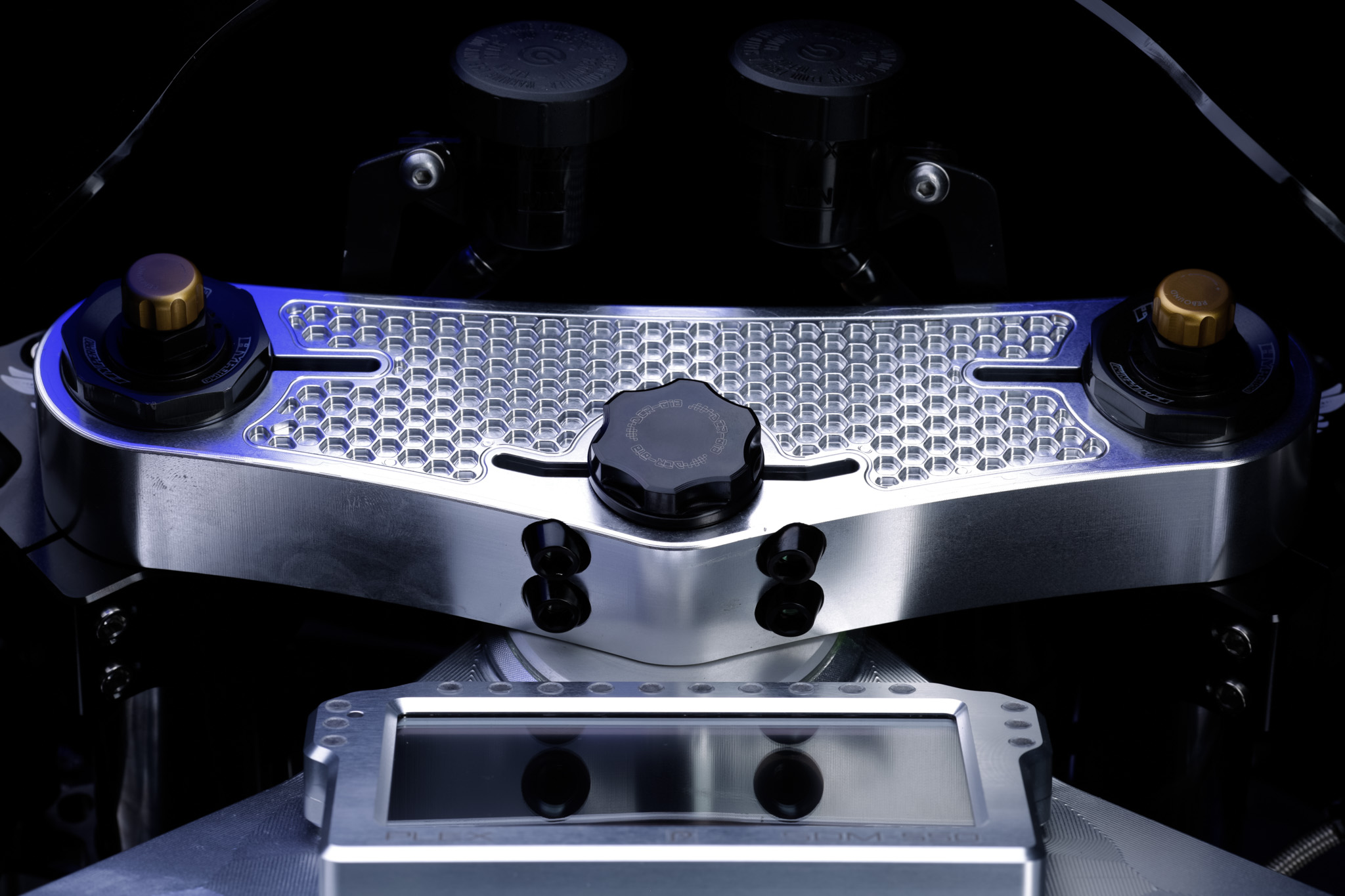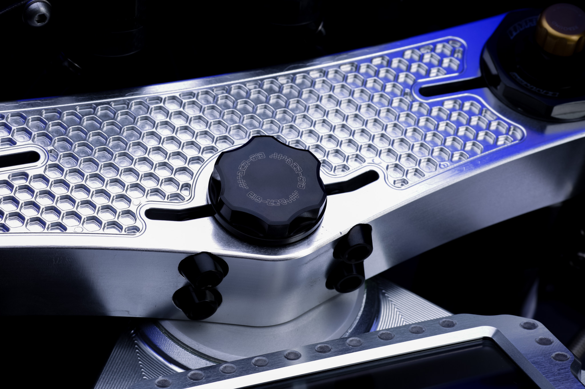 On the top triple clamp you can find the 2 minimal brake fluid reservoirs nicely fitted on CNC machined brackets, holding just enough brake fluid for your race day.