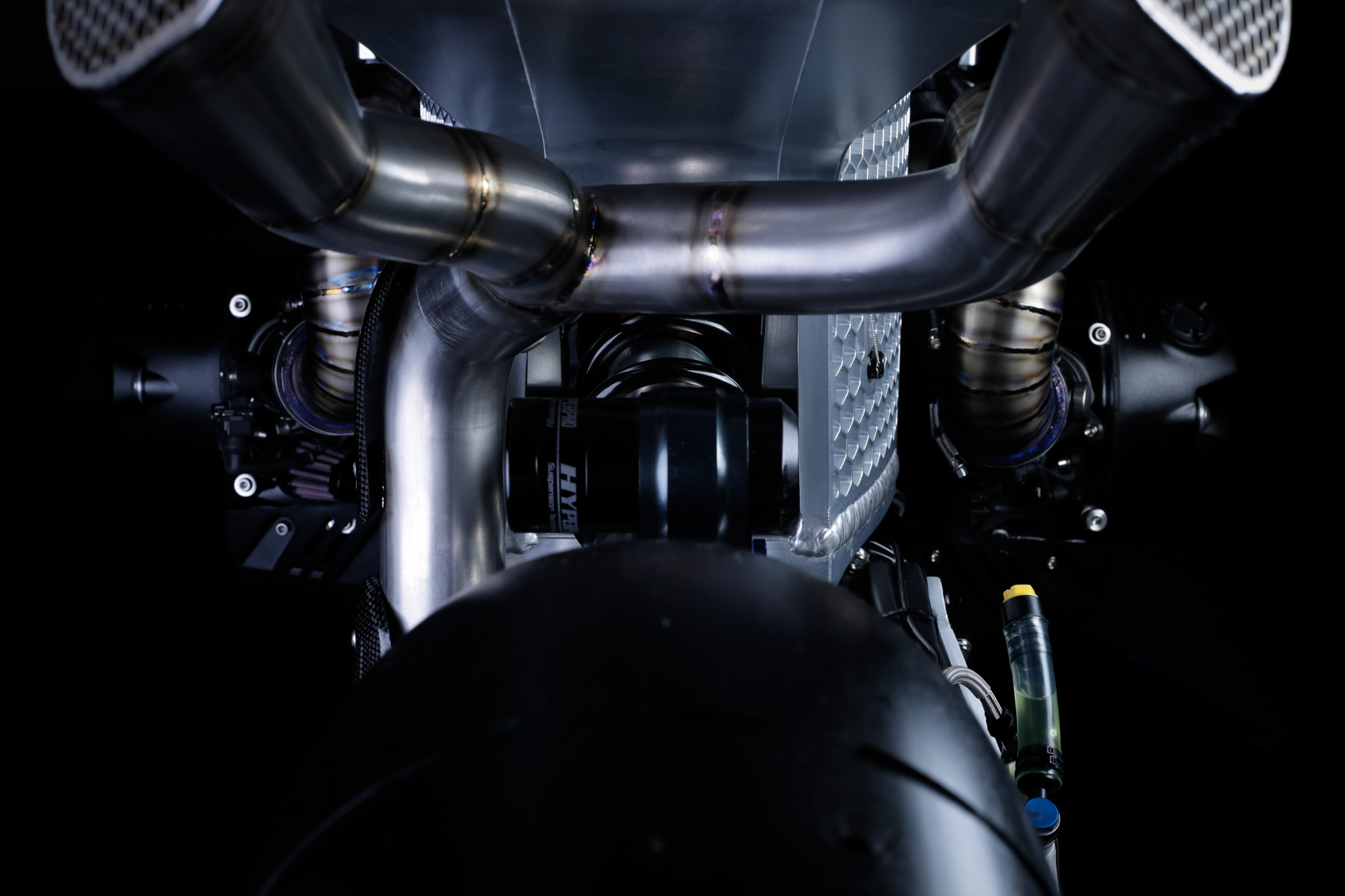 Akrapovic Titanium Evolution System, custom designed for the ‘Billet Sting’ by the Slovenian craftsman. The Titanium Mufflers with Honeycomb mesh, inspired from the MotoGP, follow the contour of the seat and match seamlessly with the frame design, thus creating a beautiful unique shape.