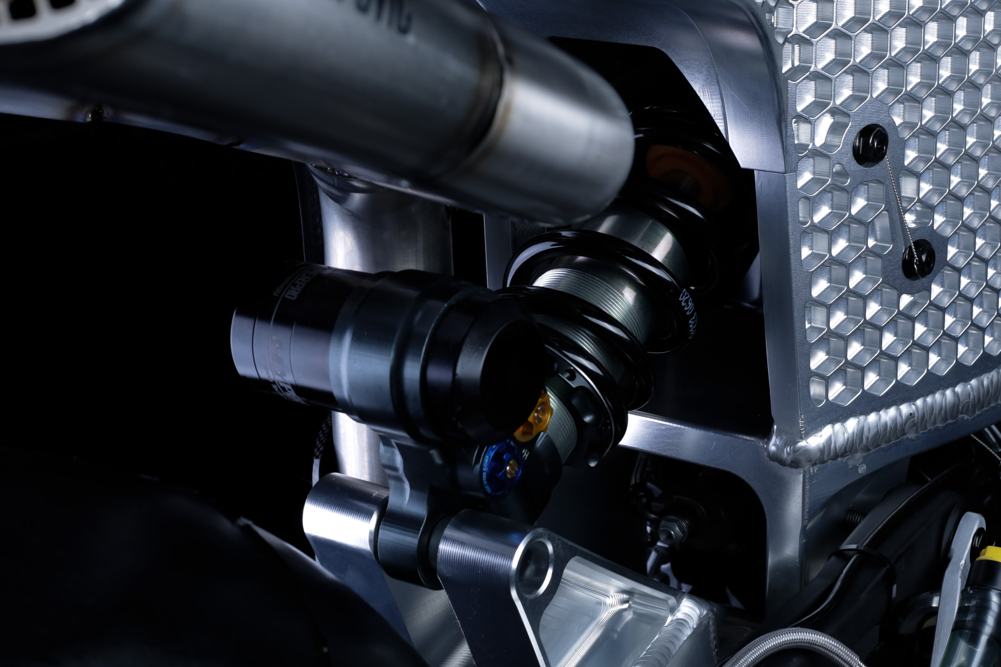 Monocoque Honeycomb design continues. The seat is also a structural part, no tubes or other hidden parts. It is seamlessly connected (bolted) to the front frame. The central part of the seat is designed to open and locks in place with a titanium quick release connector which can be operated via bare hands. Once opening the seat you can find the main switch that powers up the beast, with the ‘D’ KEY which also opens the fuel tank. Inside the seat neatly sits also the base of the exhaust mufflers!