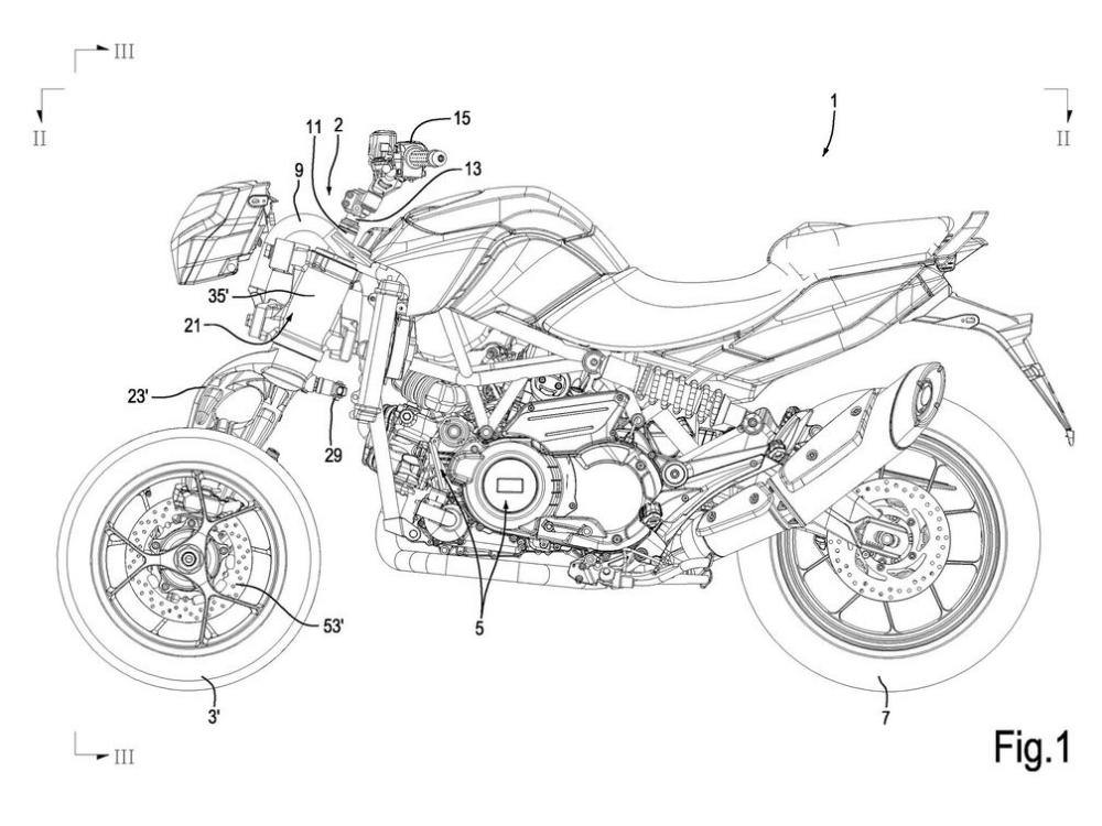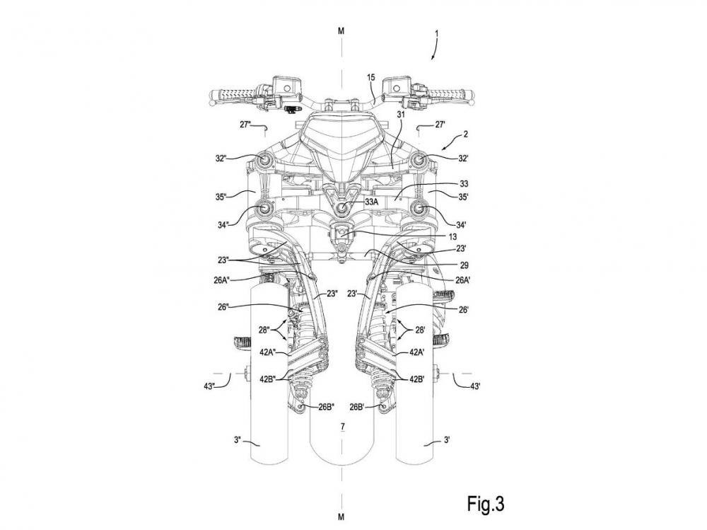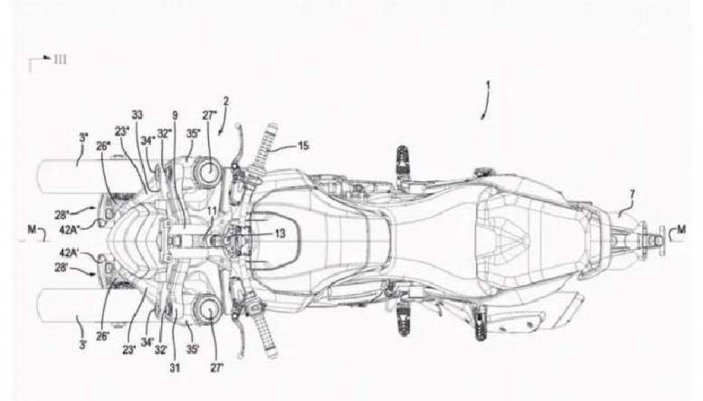 Now, this is a straight rival to Yamaha Niken. There are considerable dissimilarities however the patent comes close to Aprilia’s Mana 850 having 839.3 cc 90° V-twin engine.