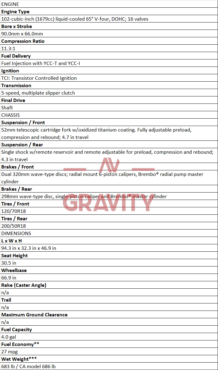 Later in 2009, we saw a major revamp with Yamaha adding 482 ccs to the present 1197cc. And made the 1679cc (102 cu in) liquid-cooled DOHC 65°V-4 powerhouse.Â