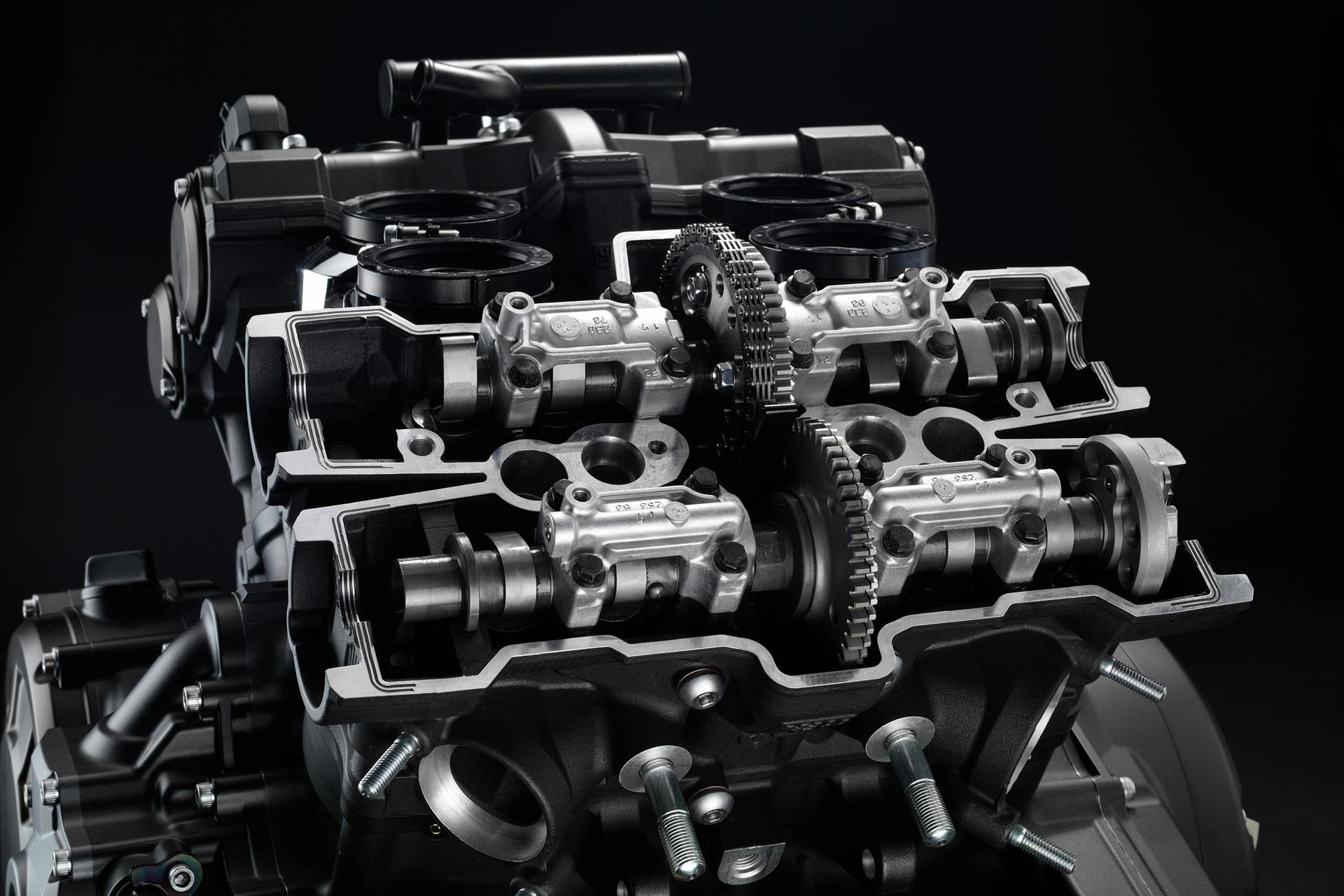 The motor combines four-valve technology with a high 11.3:1 compression ratio. Forged aluminium pistons. And NGK Iridium spark plugs with R1-type direct ignition coils to extract maximum horsepower from the fuel charge.