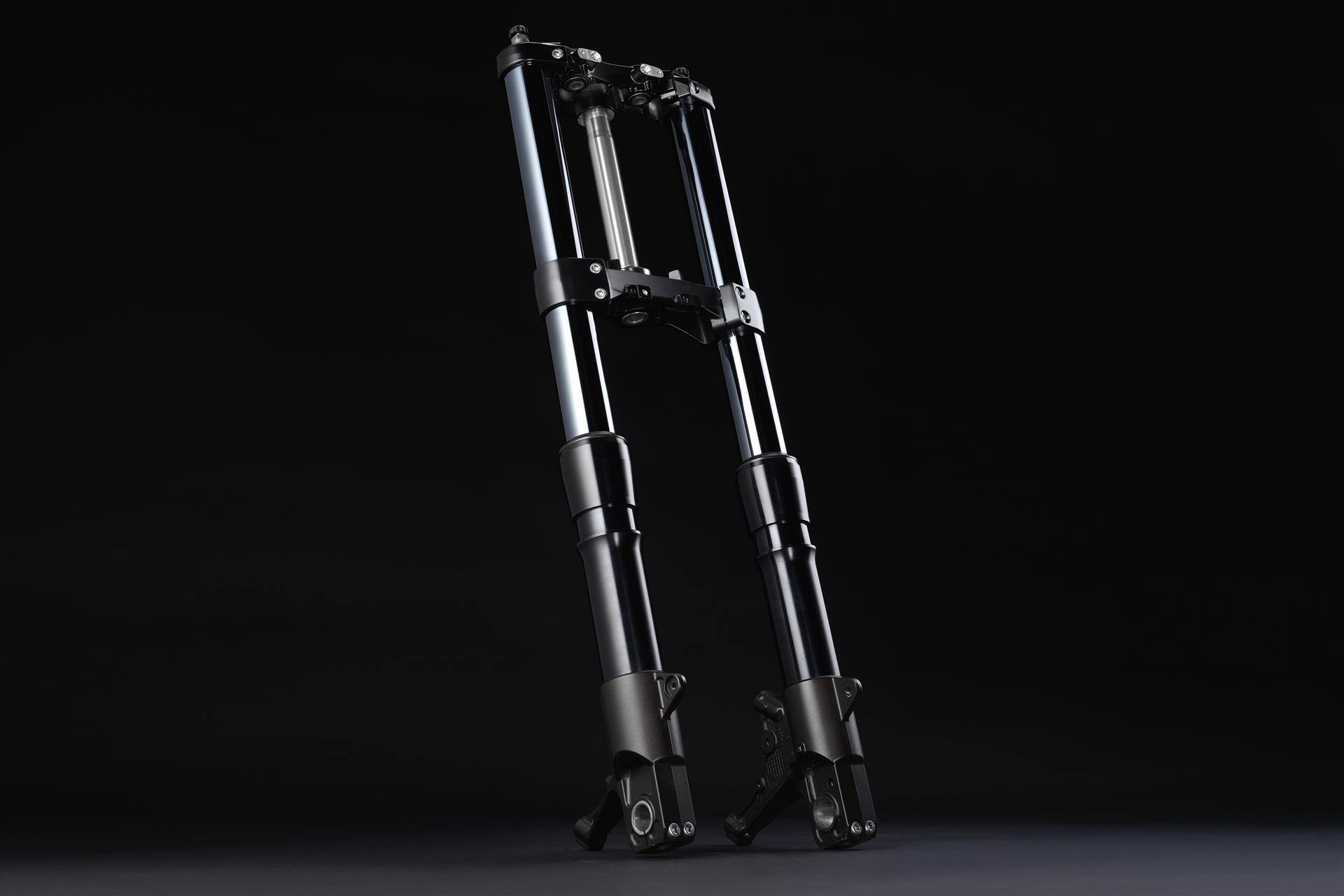 The front forks are Cartridge-damper-type, and they have 52mm inner tubes with oxidized titanium coating. Forks have both compression and rebound damping adjustability plus spring preload.