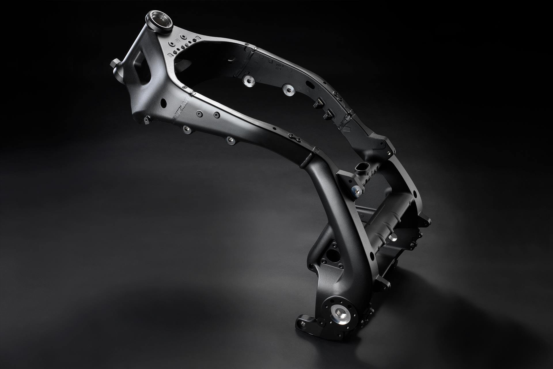 The colossal structure comes supported by a cast aluminium mainframe. Controlled-fill die-cast and extruded aluminium rear frame and cast aluminium swingarm.