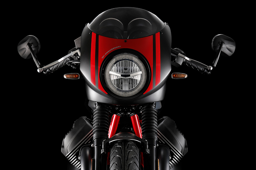 The new Moto Guzzi V7 III Racer 10th Anniversary Edition features. A new top fairing with an integrated windshield that refines the smart, sporty, and authentic cafe racer style.Â