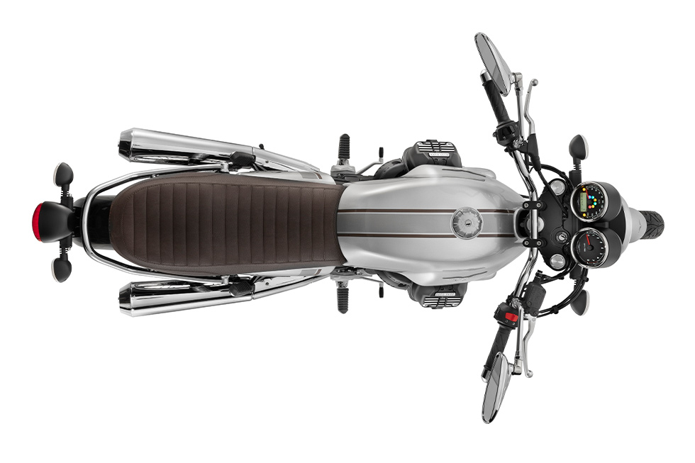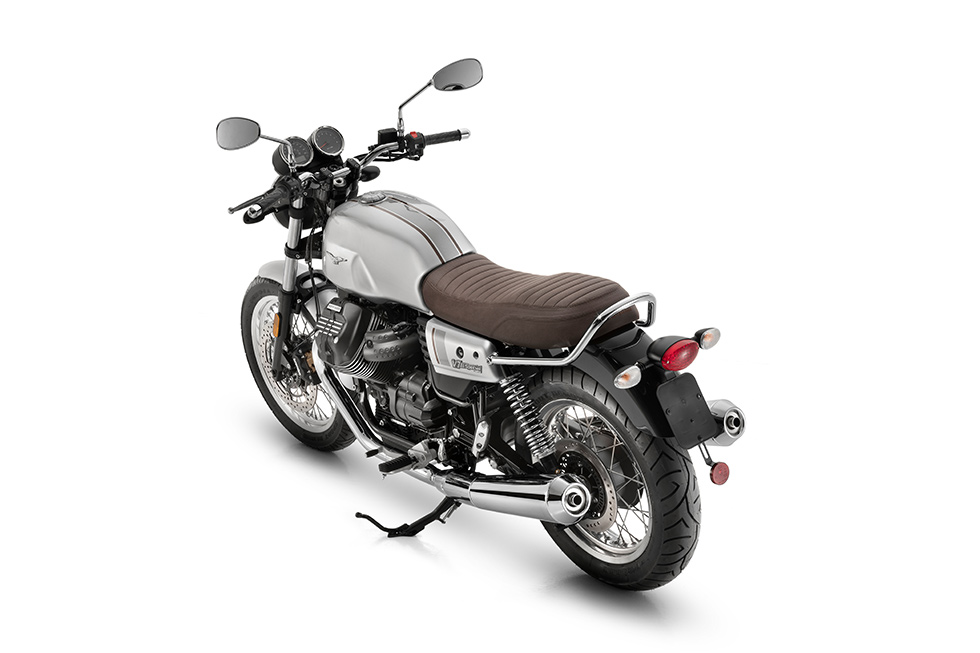 Seats with dark brown skin are embroidered with the MOTO GUZZI logo, and tack rolls emphasize the 70s style.