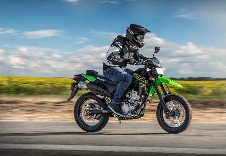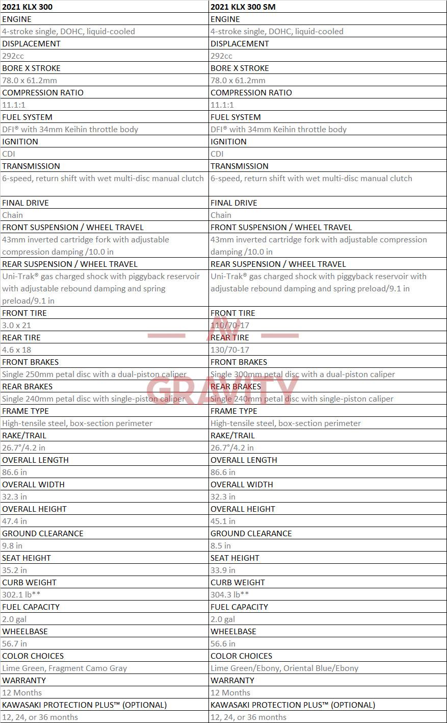 2021 KLX 300 and KLX 300 SM arrive with 292cc, 4-stroke single, DOHC, liquid-cooled motor integrated with 6-speed, return shift with wet multi-disc manual clutch.