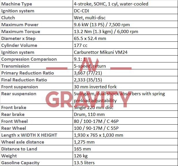 The suspension on the front is 30mm inverted fork while the opposite end gets swingarm, dual shock absorbers with spring preload adjustability. As for the brakes, the front comes with the 220mm disc and the rear with 110mm drum.