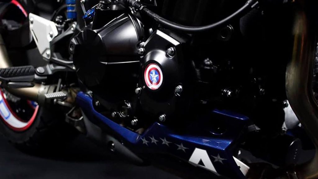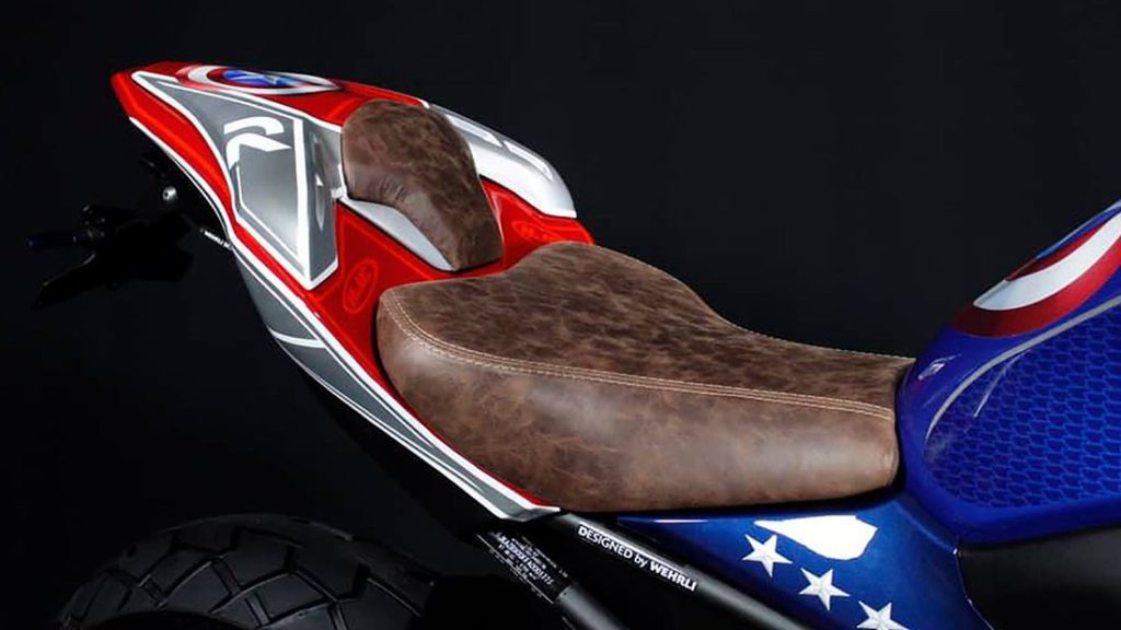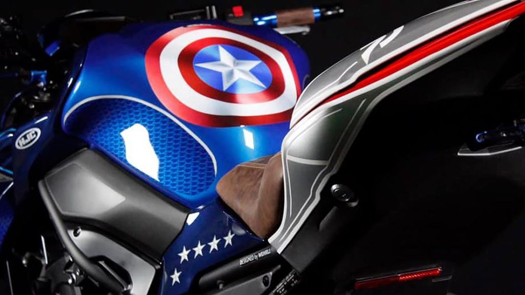 - The custom made by Swiss moto house gets the Captain America shield with a central star to the tank’s blue base colour.