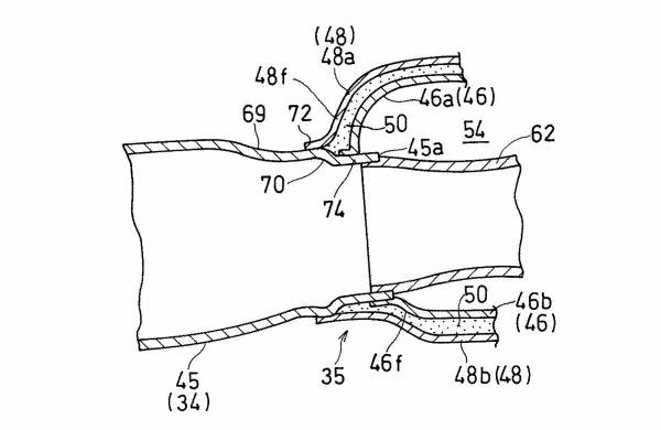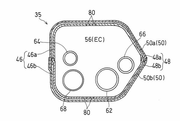 And the outer case 48 is formed by joining a pair of outer case halves 48a and 48b.