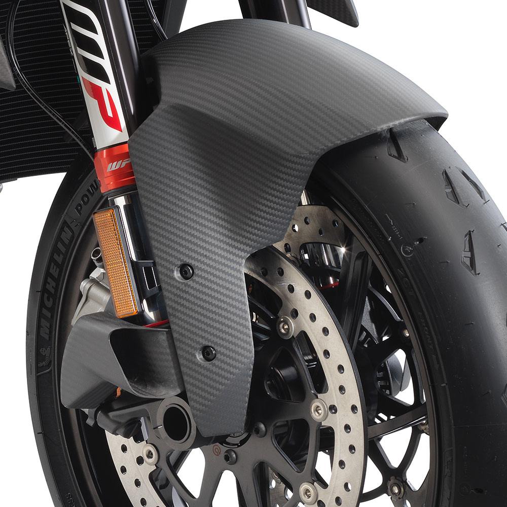 When it comes to accessories, KTM brings carbon air ducts for the brake callipers, black fork plates, carbon mudguard, guards and levers.