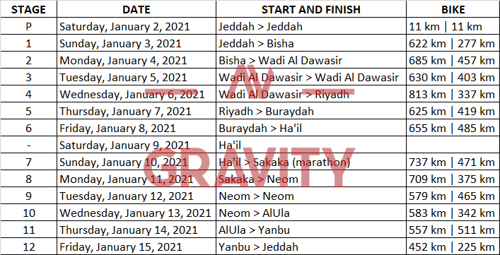 The 2021 Dakar starts from January 2, 2021, with 7,646 km course which involves 4,767 km of specials at the beginning and finish of Jeddah.