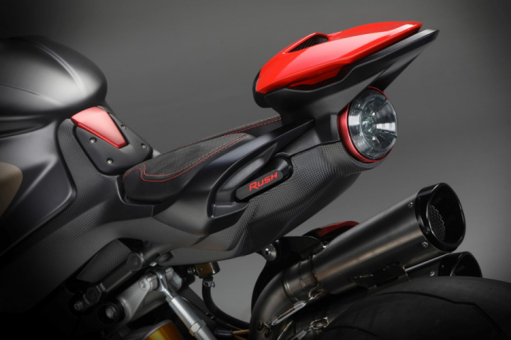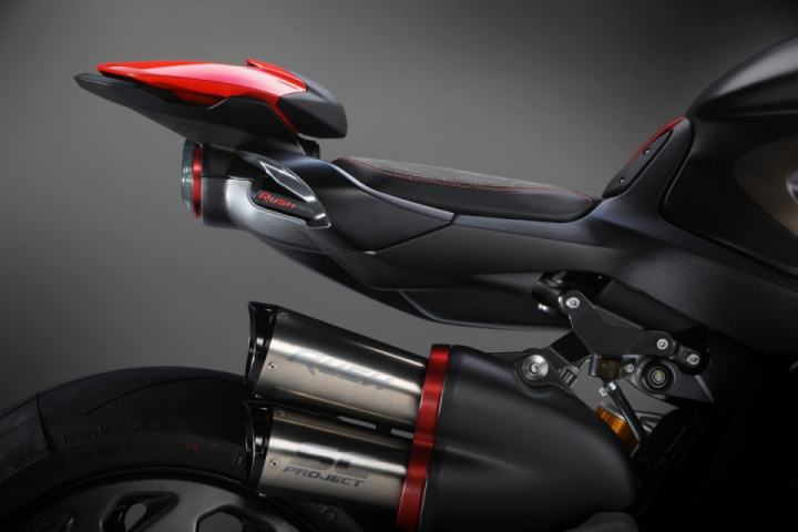 Much of the bike is covered with black and with a pillion seat like structure that is made in red. The Rush looks chunky and gets Ohlins while brake consists of Brembo Stylema calipers with 320mm discs upfront. The Rush will be retailed at € 34,000.